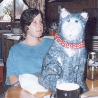 Lesley Slater is a Paper Mache Kat at my mother's house. Lesley does'nt eat, defacate, or sharpen his claws on the furniture. That is not my mother with him.